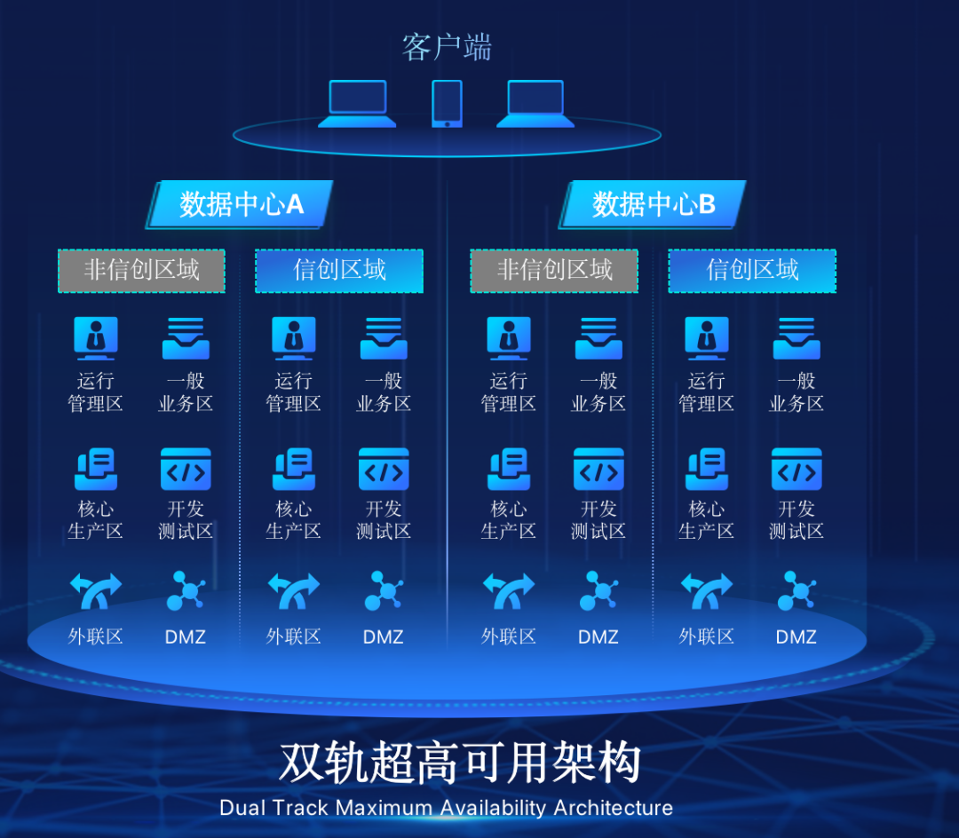 太阳成集团tyc539官网在企业面临自主创新IT基础重构过程中,推出的全新架构双轨超高可用架构(简称DTMAA),在双活数据中心的分区调度基础上,添加每个数据中心内信创域和非信创域的分域调度,来实现分区分域协同的多活双轨超高可用。