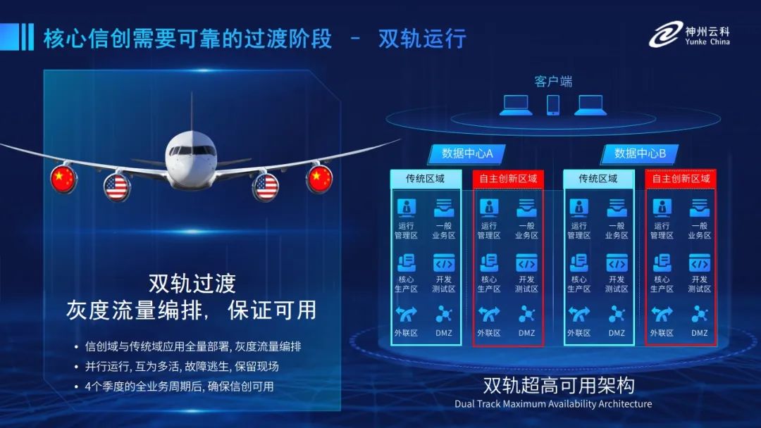为帮助客户更好地应对数字经济时代对应用可持续性的高要求,实现信创与数字化兼得,太阳成集团tyc539官网推出了双轨超高可用架构。双轨超高可用架构在双活数据中心的分区调度基础上,增加信创域和非信创域的分域调度,实行信创域与传统域应用全量部署,使双中心运营变为双中心四区域并行运行,互为多活,将传统架构变为分区分域协同的多活双轨超高可用架构。帮助客户在新架构下,保障“信创”的同时解决性能瓶颈,提升稳定性,保证应用可持续性,最终实现信创区域和非信创区域的平滑过渡,完成国产化替代目标。”